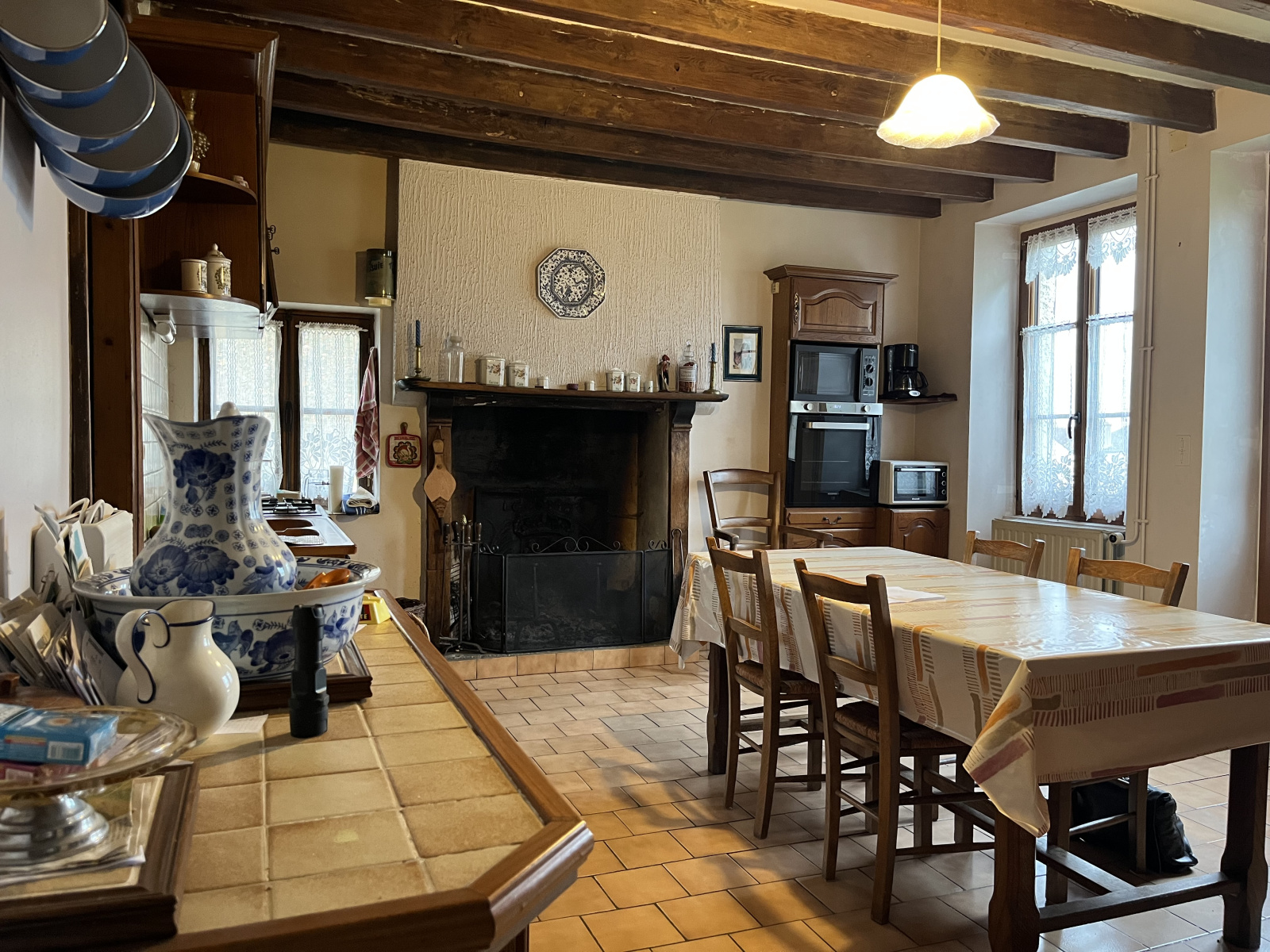 Vous y trouverez deux entrées ainsi qu'une sortie à l'arrière du bien, au niveau de son jardin. Au rez-de-chaussée, les futurs acquéreurs découvriront une grande cuisine avec ses poutres apparentes ainsi qu'une cheminée ouverte, donnant à cette pièce et à l'ensemble du bien un cachet propre aux anciennes longères.